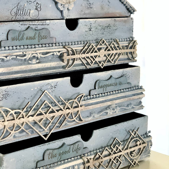 I picked the colors from our palette, added a few plastic figurines and all this created the base for the work. After that I took my favorite chipboard and designed the back of the box. Now it is a nice decoration of the interior and a useful object at the same time!